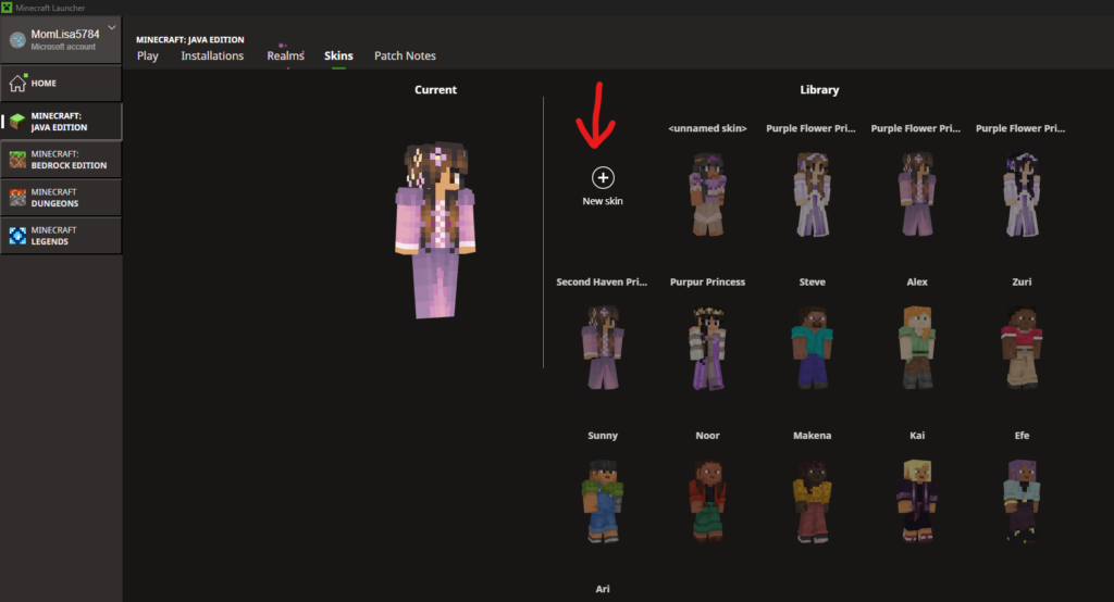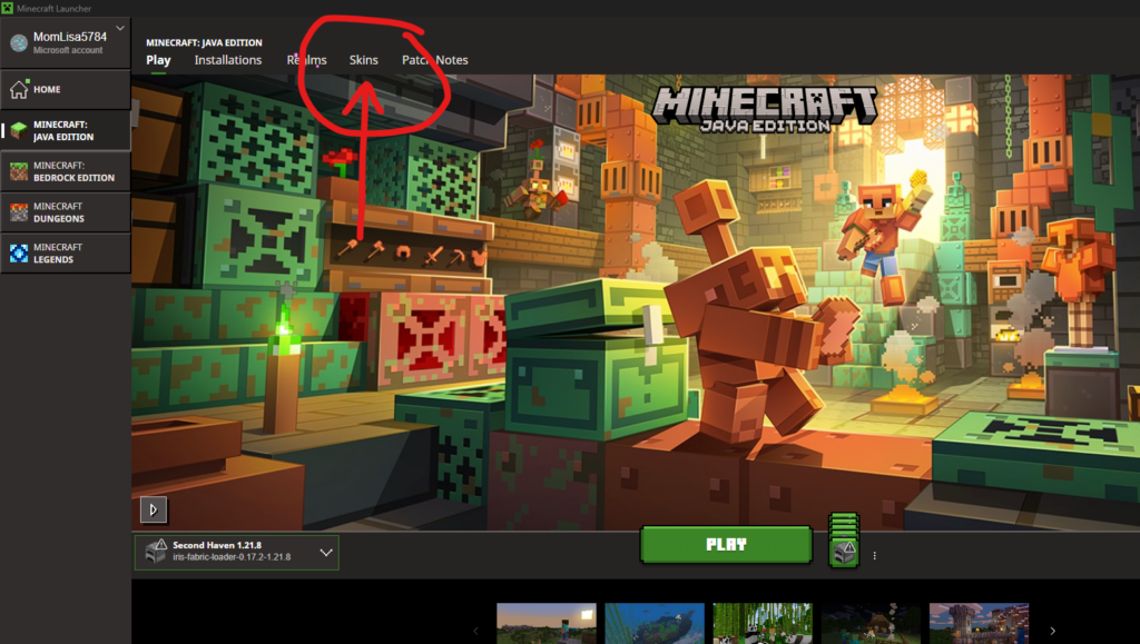 Then open your Minecraft Launcher and select Skins in the top menu.