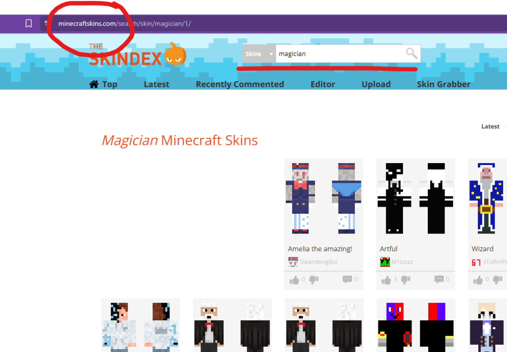 To change your appearance, start by finding a Minecraft skin you like. You can search websites such as MinecraftSkins.com. Search using any keywords that capture how you would like to appear. For example, here I’ve searched for “magician.” Countless people have created and shared skins in this collection. Some are simple. Some are amazing. You may need to sift through a few to find one you like.