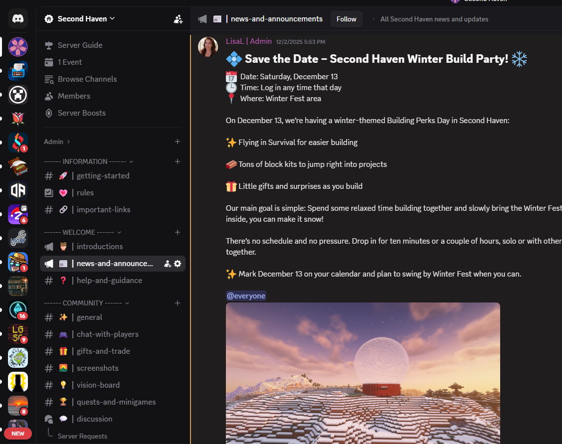 Learn more about the difference between Java and Bedrock in this video: Which is better? (Two quick points: If you want beautiful lighting, Java is a must. Modifications that are free in Java cost “coins” in Bedrock.) Second Haven supports crossplay between Java and Bedrock. You can join using either edition.