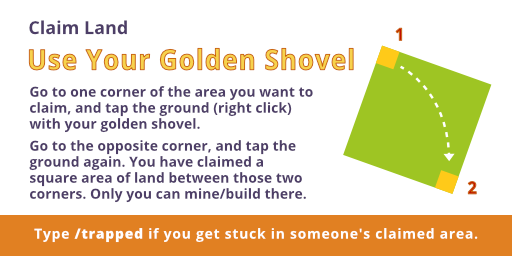 To claim land, use a golden shovel to mark out an area you want to protect. If you hold a stick in your hand and right-click, the border of your claimed land will be highlighted with gold blocks.
