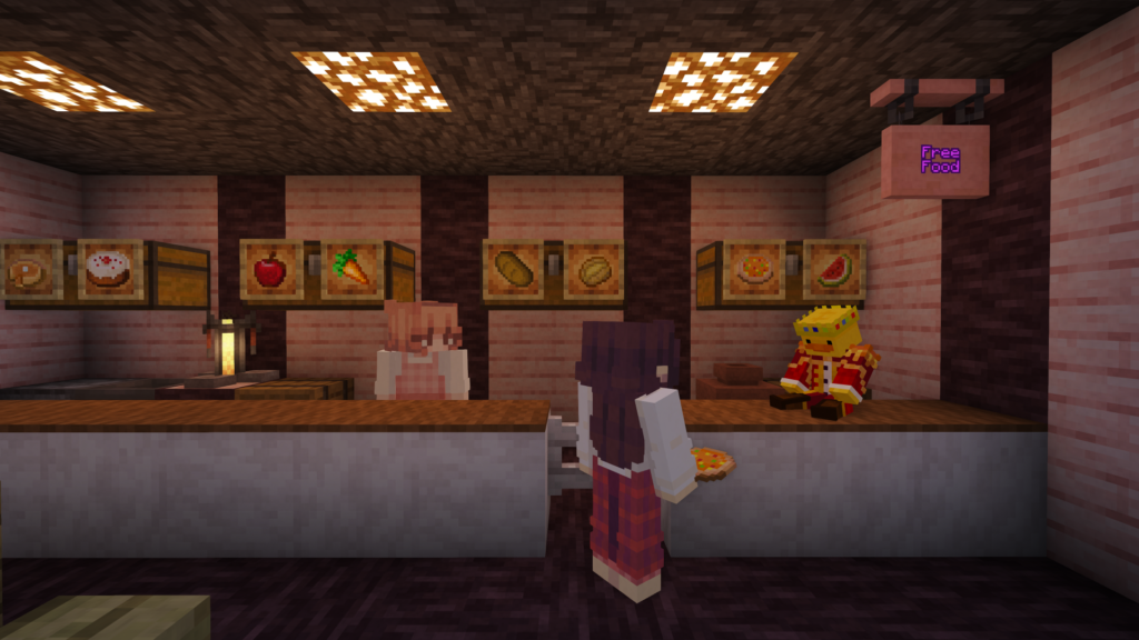 Once you have your bearings, you’ll want to find food. In our main world, you do not need to worry about dangerous creatures (called “hostile mobs”), but you’ll still need to eat. If you head over to the cafe (a small building on the side of the hill just past the bookshop), you can click on the character behind the counter, and she’ll give you free food. When you’re hungry, just hold the food in your hand and hold down your right mouse button.