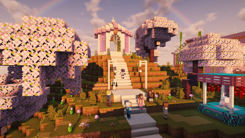 First, you’ll enter the world at a specific location called the spawn point. In Second Haven, the spawn point is a welcome area with guides and information. You’ll appear in a gazebo at the top of a hill overlooking rivers and groves of cherry blossom trees and houses.